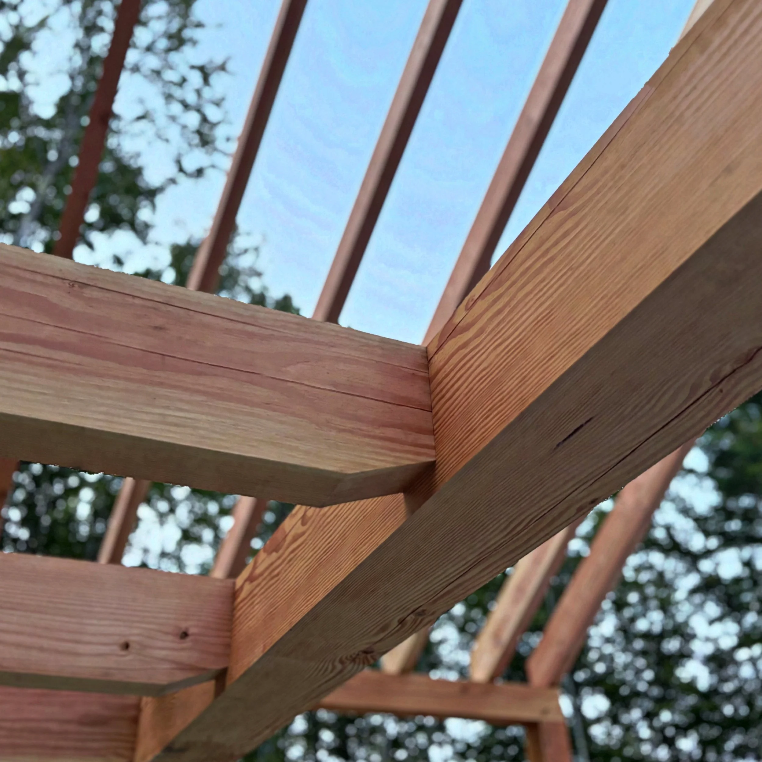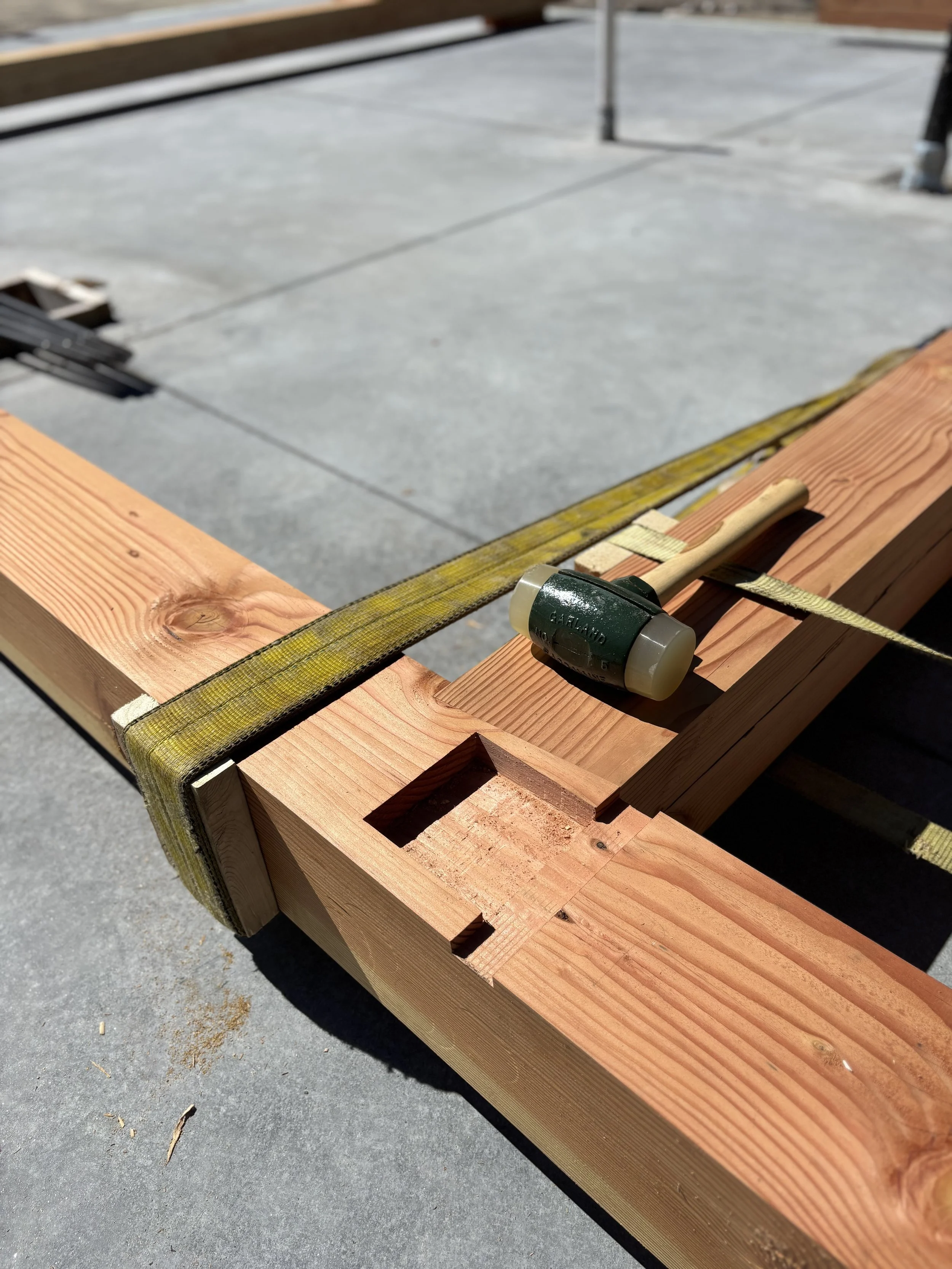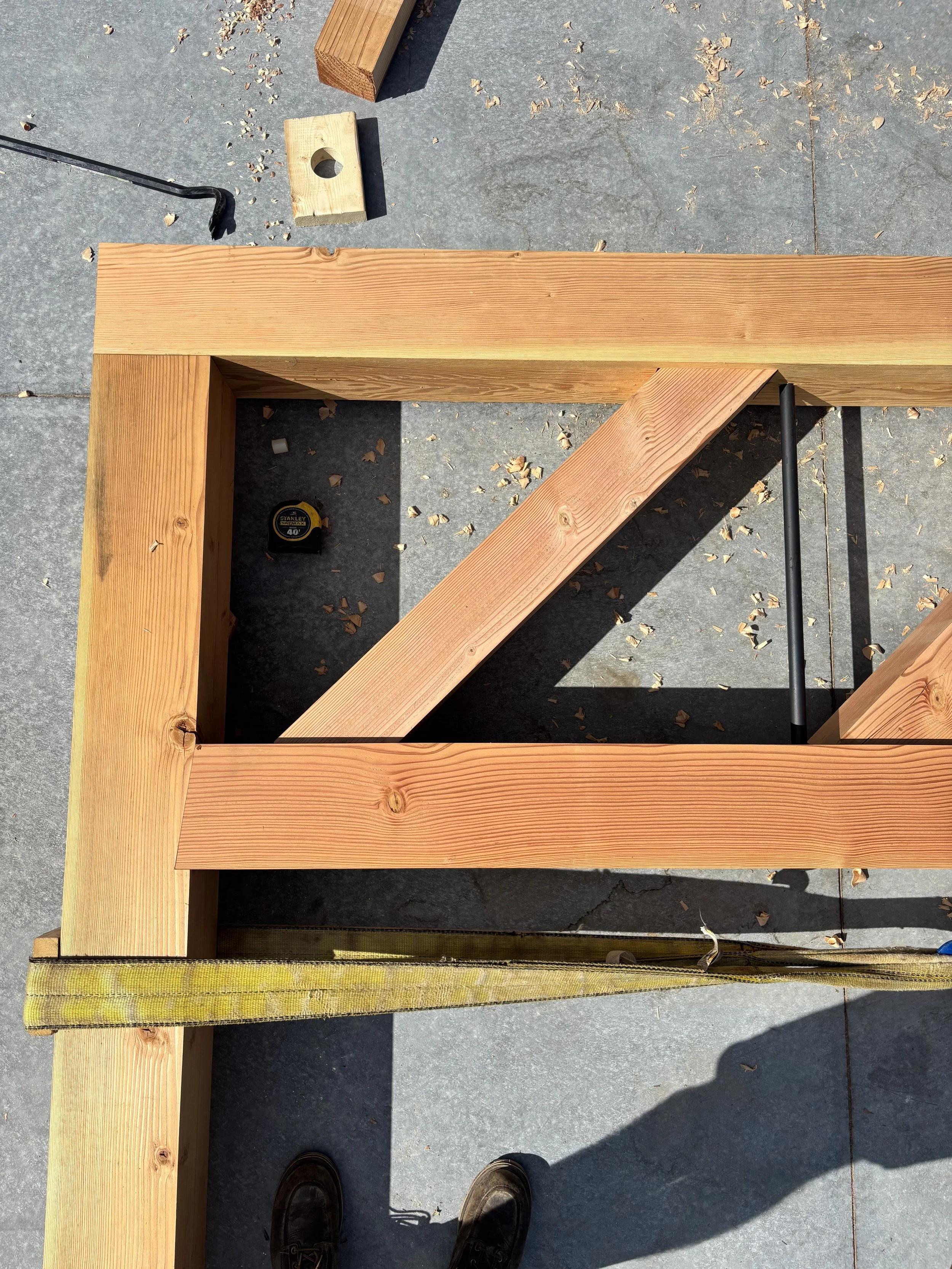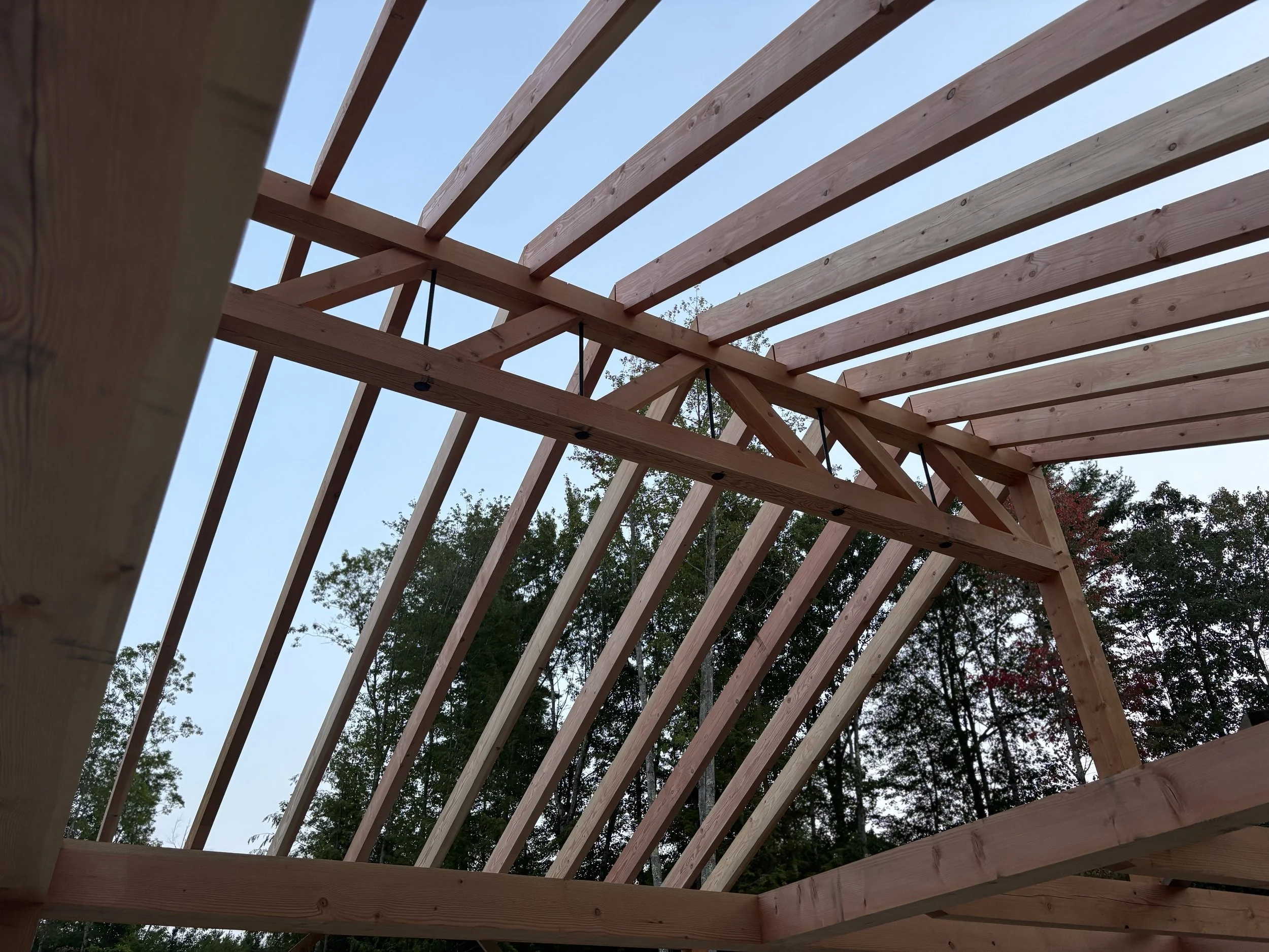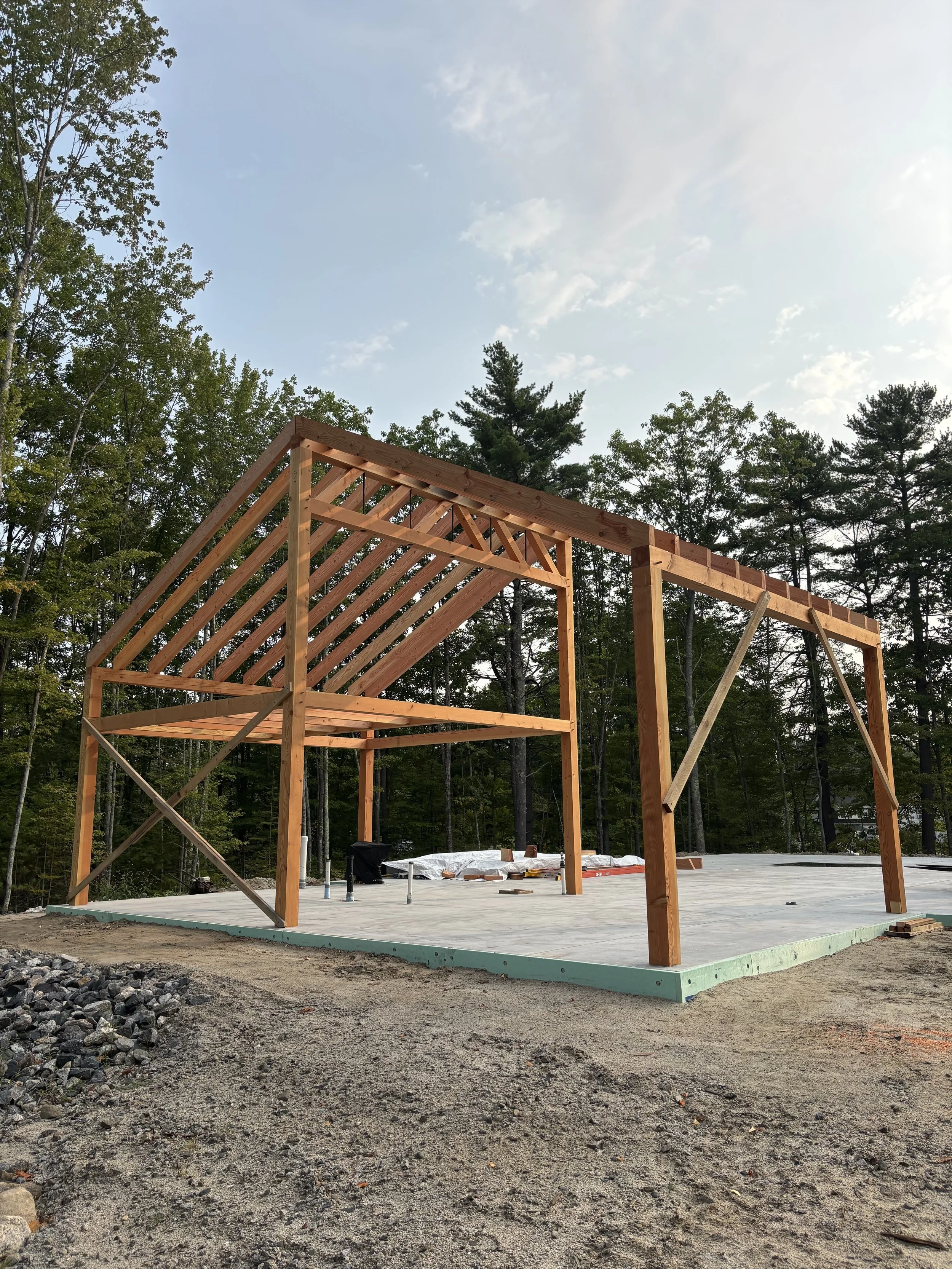 This Douglas Fir frame raised in Naples provides office and staff space for an adjoining workshop. The frame is entirely FOHC (free of heart center) timber sourced from sustainable forests in Oregon. A 20’ long parallel chord truss acts as a structural ridge beam allowing the interior volume to be entirely post free.